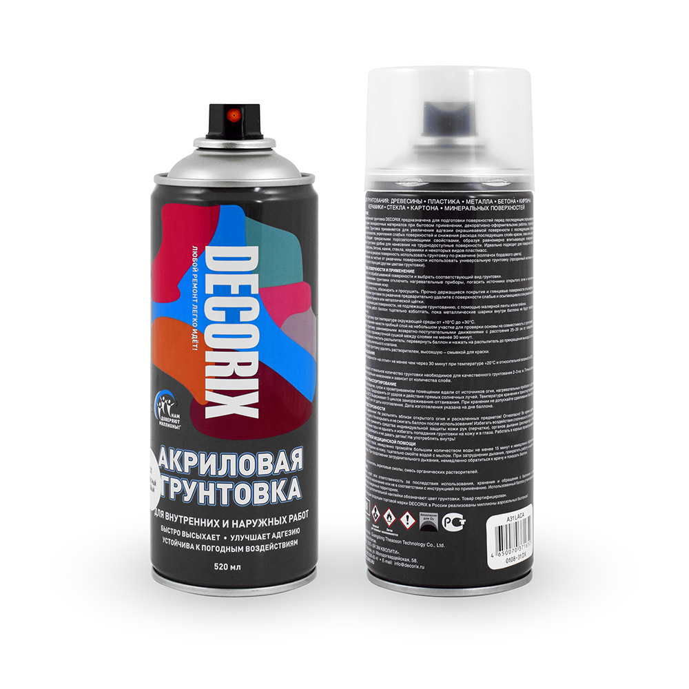 Высококачественная грунтовка DECORIX предназначена для подготовки поверхностей перед последующим окрашиванием любыми видами лакокрасочных материалов при бытовом применении, декоративно-оформительских работах, строительстве и ремонте. Грунтовка применяется для увеличения адгезии окрашиваемой поверхности с последующими слоями наносимых материалов, укрепления слабых поверхностей и снижения расхода последующих слоев краски, лака или эмали. Грунтовка обладает прекрасными порозаполняющими свойствами, образуя равномерно впитывающую поверхность. Аэрозольная грунтовка удобна для нанесения на труднодоступные поверхности. Идеально подходит для поверхностей из металла, древесины, бетона, камня, стекла, керамики и некоторых видов пластмасс.