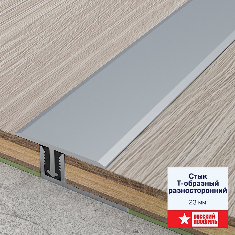 Стык Т-образный разносторонний 23х1800 мм Русский профиль, серебро матовое — плоский алюминиевый порог для маскировки монтажных зазоров между одноуровневыми поверхностями. Профиль можно устанавливать на стыке как однородных покрытий, так и материалов разных типов. Подходит для паркета, ламинированного паркета, керамической плитки.
