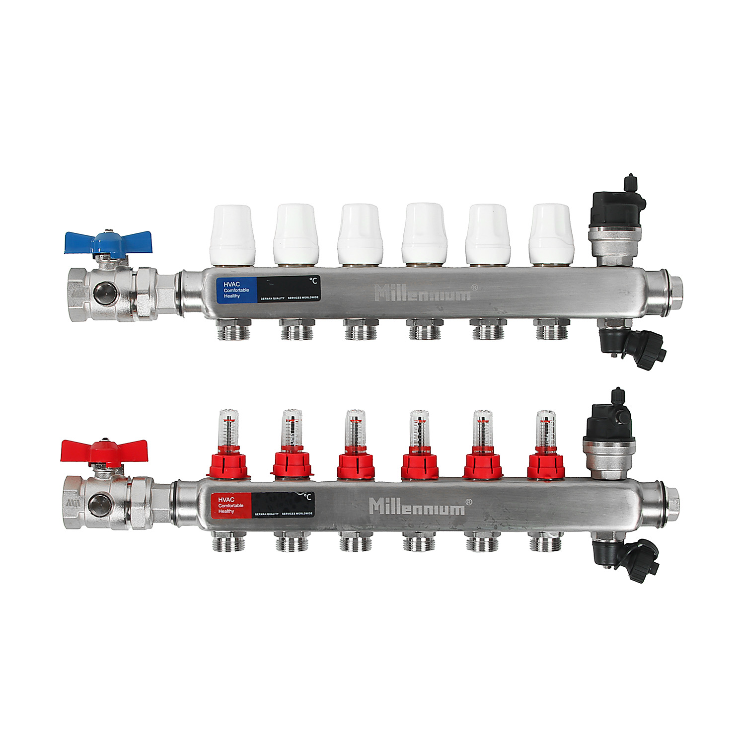 Коллекторная группа Millennium с расходомерами выполнена из нержавеющей стали, имеет регулировочные и термостатические вентили. Применяется при монтаже радиаторного отопления и теплых полов.