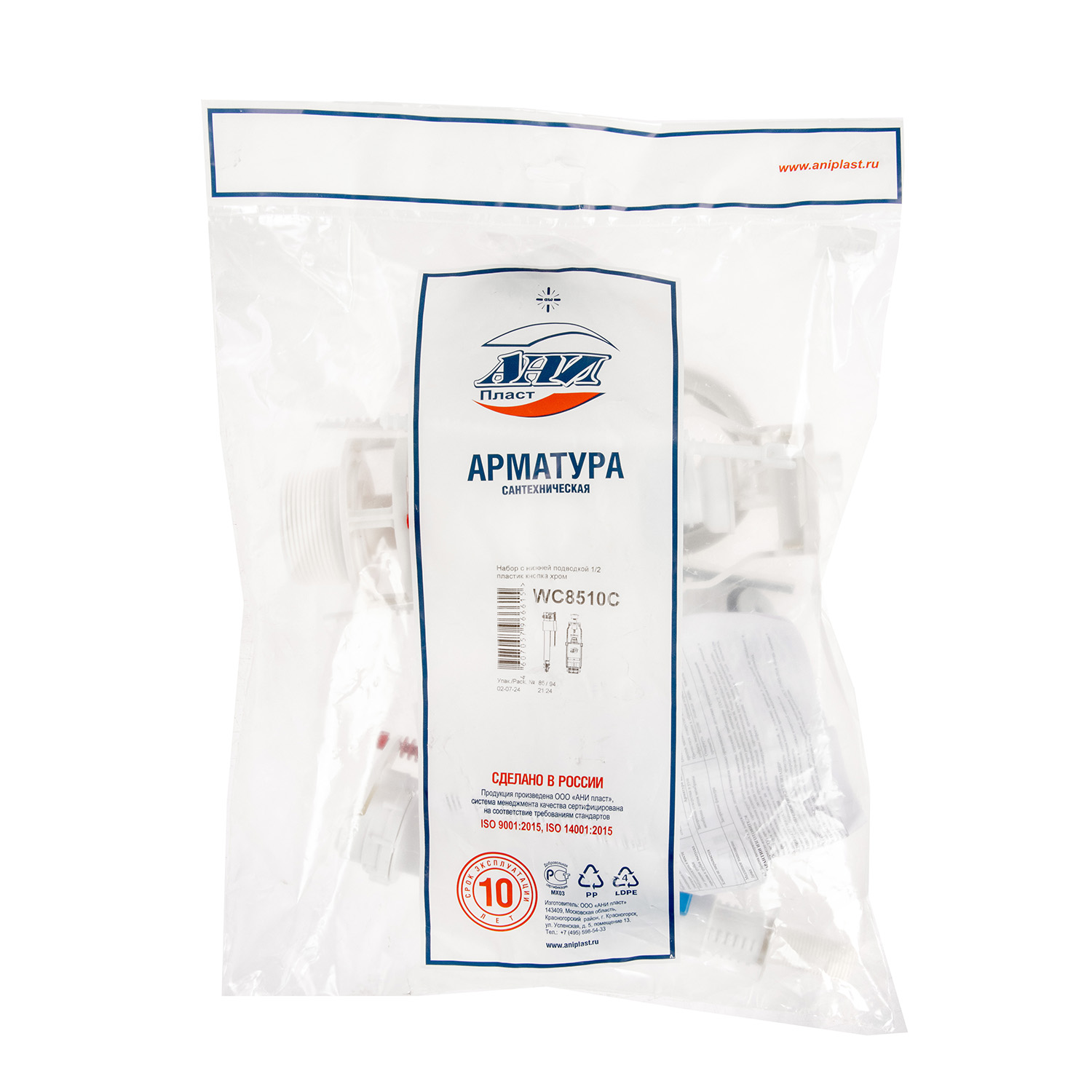 Арматура бачка АНИ Пласт, нижний подвод, кнопка белая