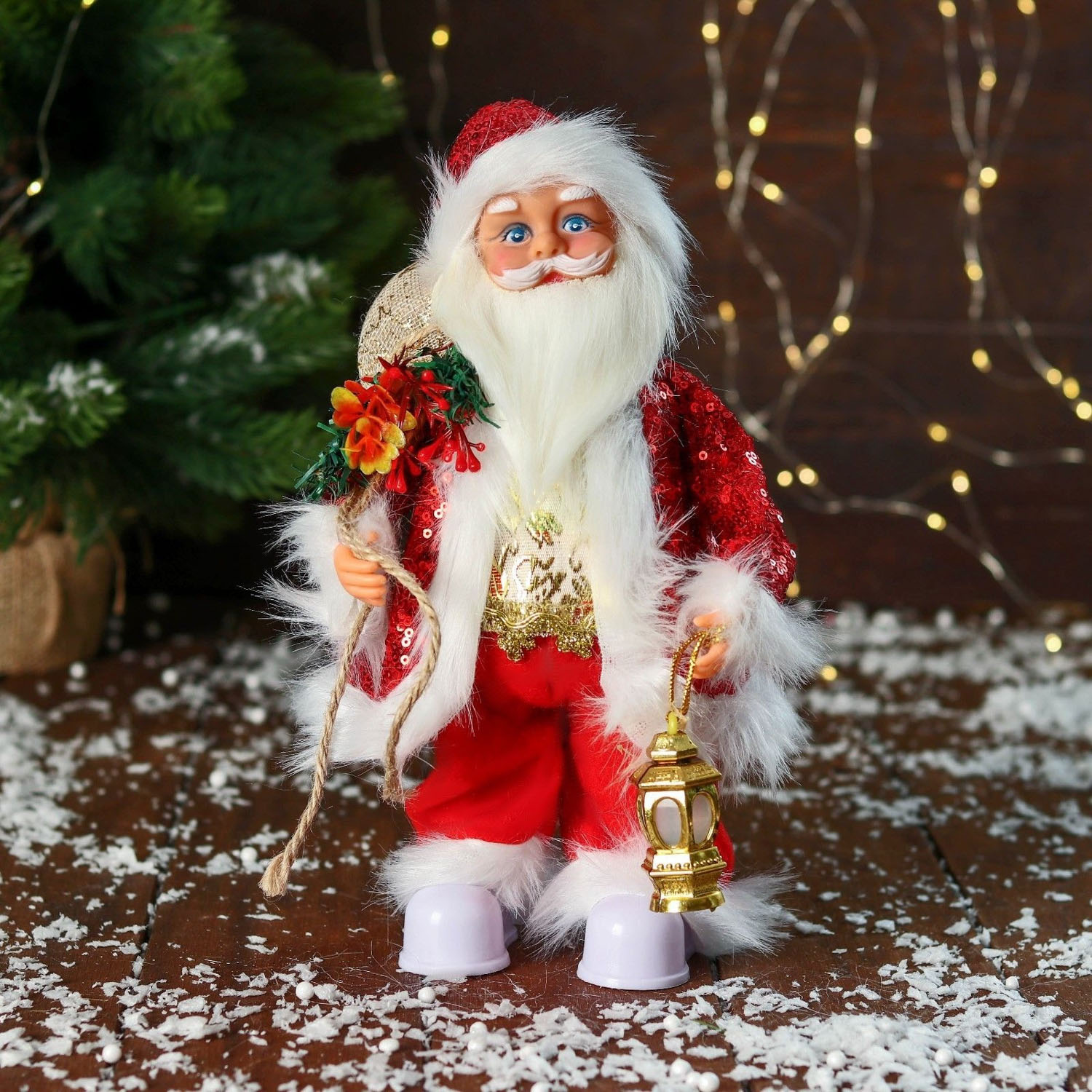 Дед Мороз "В костюме с пайетками, с фонариком" двигается, с подсветкой, 28 см, красный   9692506